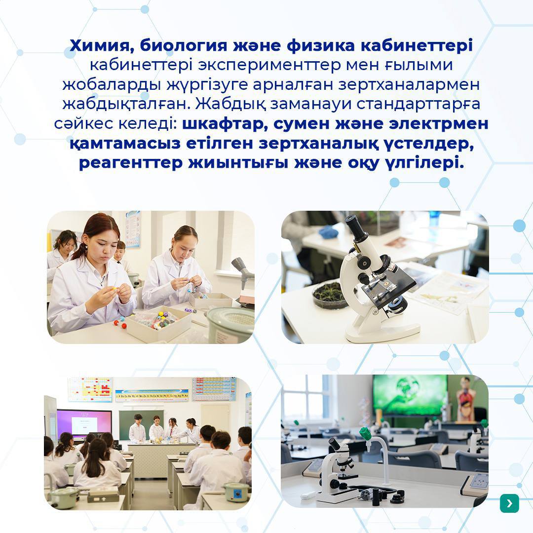 Мемлекет басшысының тапсырмасы бойынша елімізде «Келешек мектептері» ұлттық жобасы қарқынды жүзеге асырылуда. Барлық оқу кабинеттері жаңа технологиялармен – интерактивті тақталармен және компьютерлермен жабдықталған, бұл оқытудың инновациялық әдістерін енгізуге және білім беру процесінің сапасын арттыруға ықпал етеді.