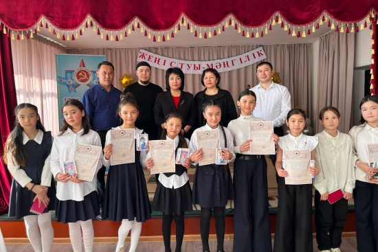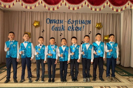 "Ұлы жеңістің 80 жылдығы мен Отан қорғаушылар күні" мерекелеріне орай "Патриот" акциясы аясында өткізілетін мектепішілік іс-шаралар жоспарына сәйкес ДТІЖО Е. А. Алгожин, аға тәлімгер А. Т. Касымова, музыка жетекшісі А. Ж. Балхаштың ұйымдастыруымен «Отан!